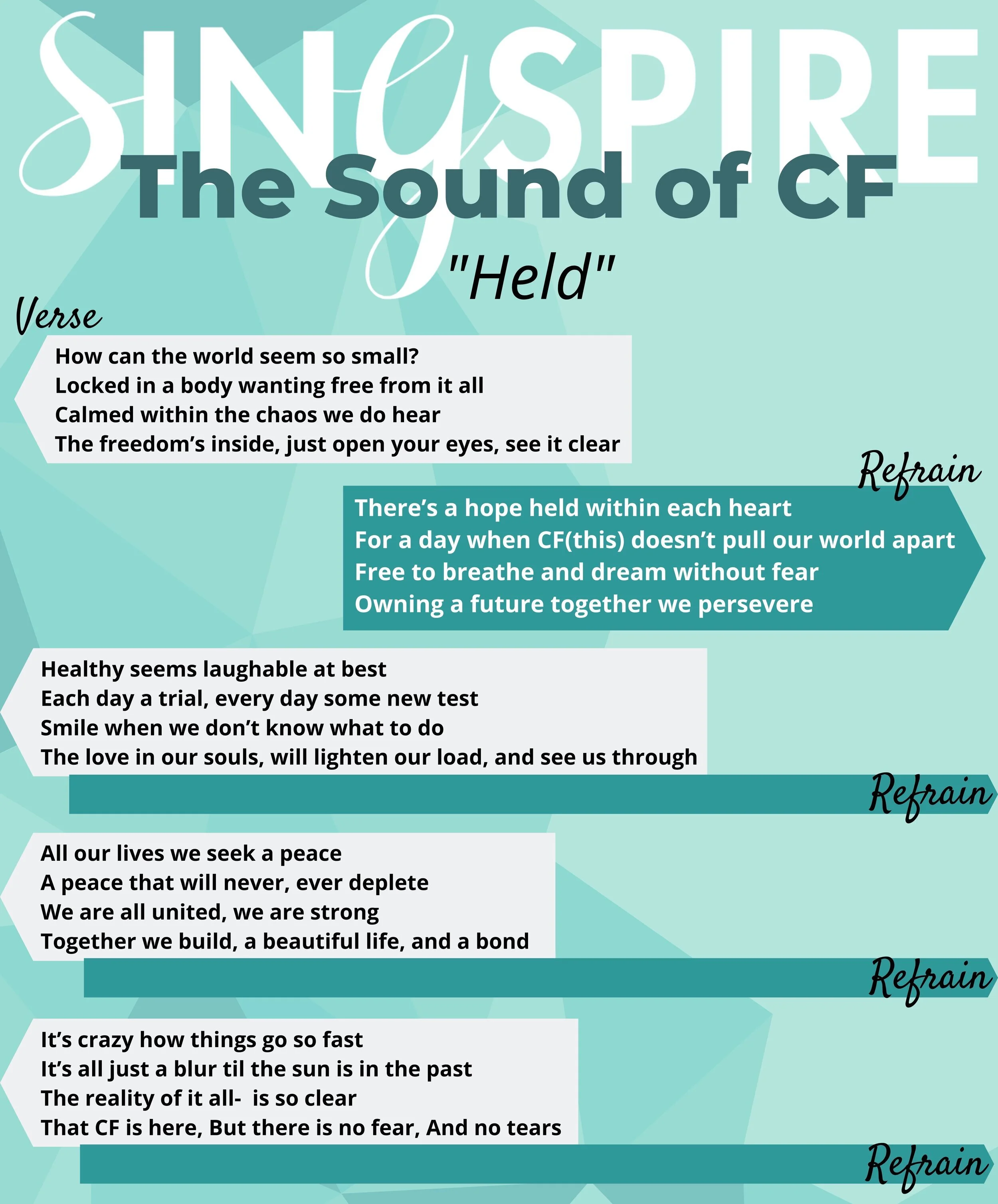 Home About Us Our Organization Our Story Our Impact Our Supporters Cystic Fibrosis Supportive Literature Our Programs The Voice Lesson Program Enrollment Info & Form Meet our Instructors *sINgSPIRE Virtual Choir SVC9: "There's a Mountaintop" Events Sing It for CF: A Marathon of Song Backyard Bash at Levitt at the Falls Cocktails for a Cause Store Donate